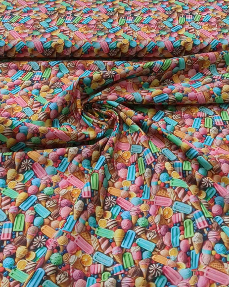 Hochwertige Baumwolle digital bedruckt mit bunter Eiscreme und anderen Süßigkeiten.